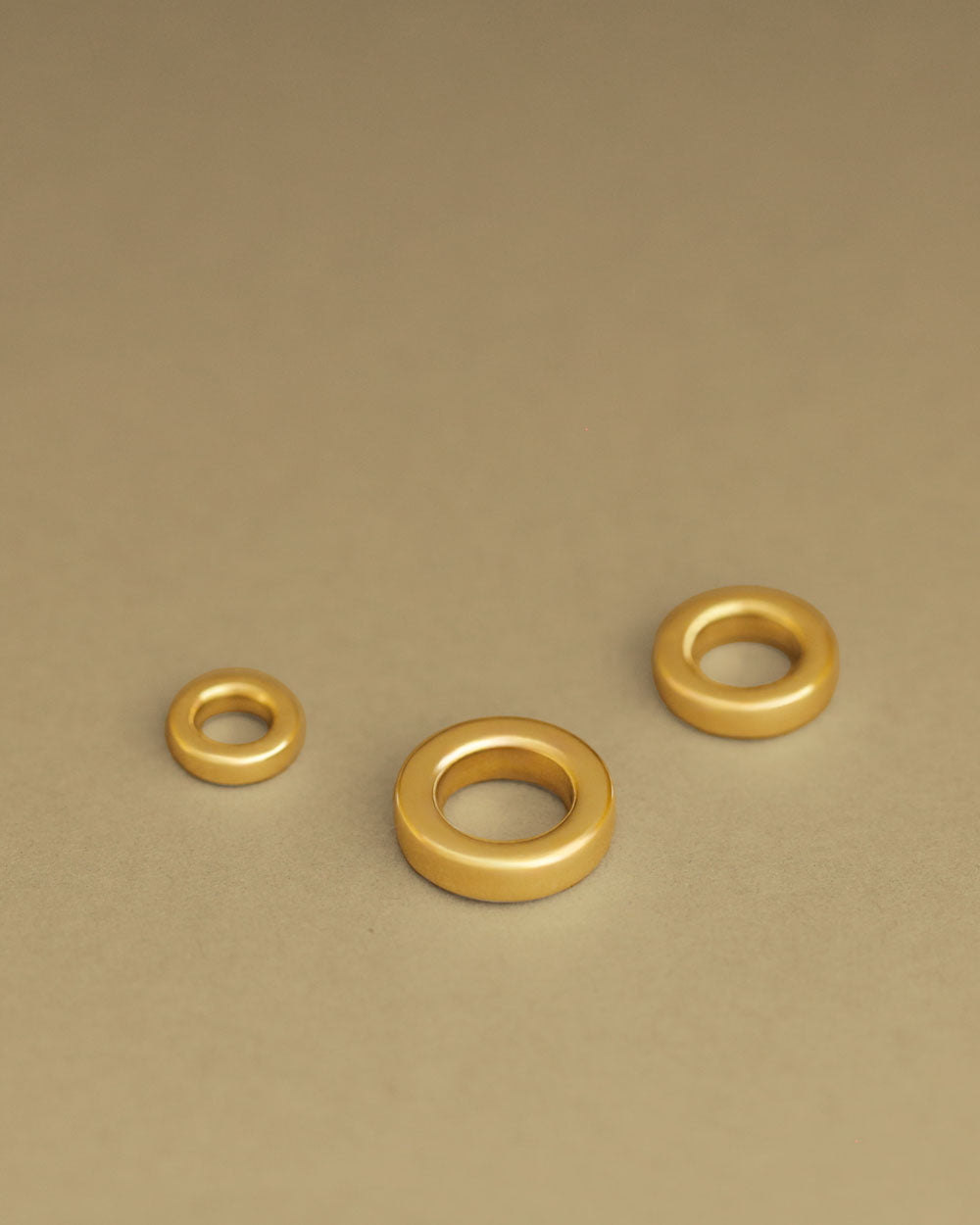 • Miniature versions of our beloved Essential Band, made to string singly or in groups of two, three, or more onto our Round Box Chain. Perfectly shaped, perfectly weighted.